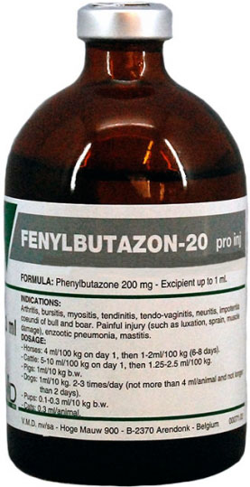 Противопоказания: Применение животным с заболеваниями сердца, печени, почек, с язвенной болезнью желудка и двенадцатиперстной кишки, с заболеваниями кроветворной системы и повышенной чувствительности к препарату. Не назначать фенилбутазон одновременно с другими нестероидными противовоспалительными препаратами. Новорождённые и очень старые животные представляют собой группу риска.