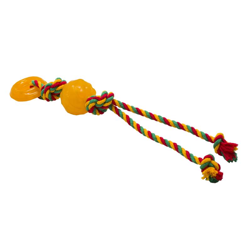 Игрушка, изготовленная из прочного хлопчатобумажного каната, мяча и кольца мини, послужит прекрасным развлечением для Вашей собаки. Используется как снаряд для аппортировки в качестве мотиватора на площадке. Подойдет для средних собак.