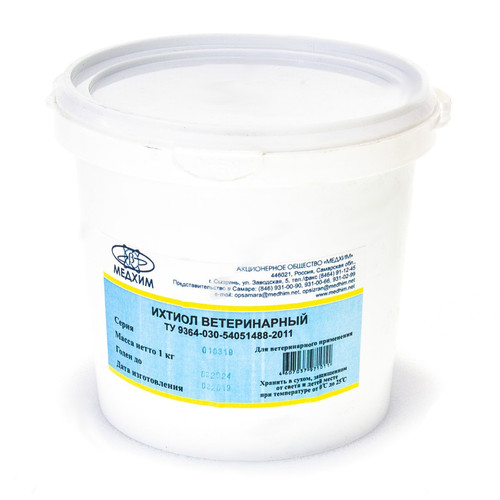 Ихтиол ветеринарный представляет собой смесь аммониевых солей сульфоновых кислот, получаемых сульфированием и последующей нейтрализацией аммиаком продуктов перегонки битуминозных сланцев, содержащих остатки ископаемых морских животных и рыб.