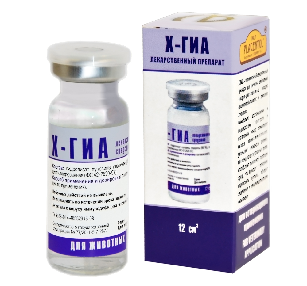 Х-ГИА вводят животным внутримышечно в следующих дозах: животным весом до 5 кг — 0,5 мл на одно животное, весом 5 – 25 кг — 1 мл на одно животное, весом свыше 25 кг — 2 мл на одно животное. Курс лечения — 7 – 10 инъекций с интервалом 48 часов. Лекарственное средство не требует разведения новокаином. Инъекцию необходимо делать в мягкие ткани в область пораженного сустава. С целью коррекции возрастных изменений суставов и болезней, связанных с периодом интенсивного роста и формирования скелета у молодняка животных (в возрасте от 4,5 до 8 месяцев, когда интенсивность нарастания мышечной массы опережает формирование суставов и появляется хромота перемежающего типа) Х-ГИА вводят в пораженную конечность в вышеуказанных дозах с применением циркулярной новокаиновой блокады. Максимальный курс лечения — 10 инъекций. Х-ГИА совместим с другими лекарственными средствами и кормовыми добавками.
