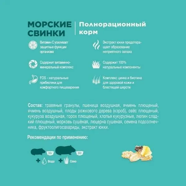 Полнорационный корм с добавлением витаминов и минеральных веществ. Разработан с учетом специфических потребностей морских свинок и содержит повышенное количество витамина С, жизненно необходимого для их здоровья. Разнообразный состав корма включает в себя травяные гранулы, воздушные ингредиенты и хлопья, семена, овощи и редкие плоды.