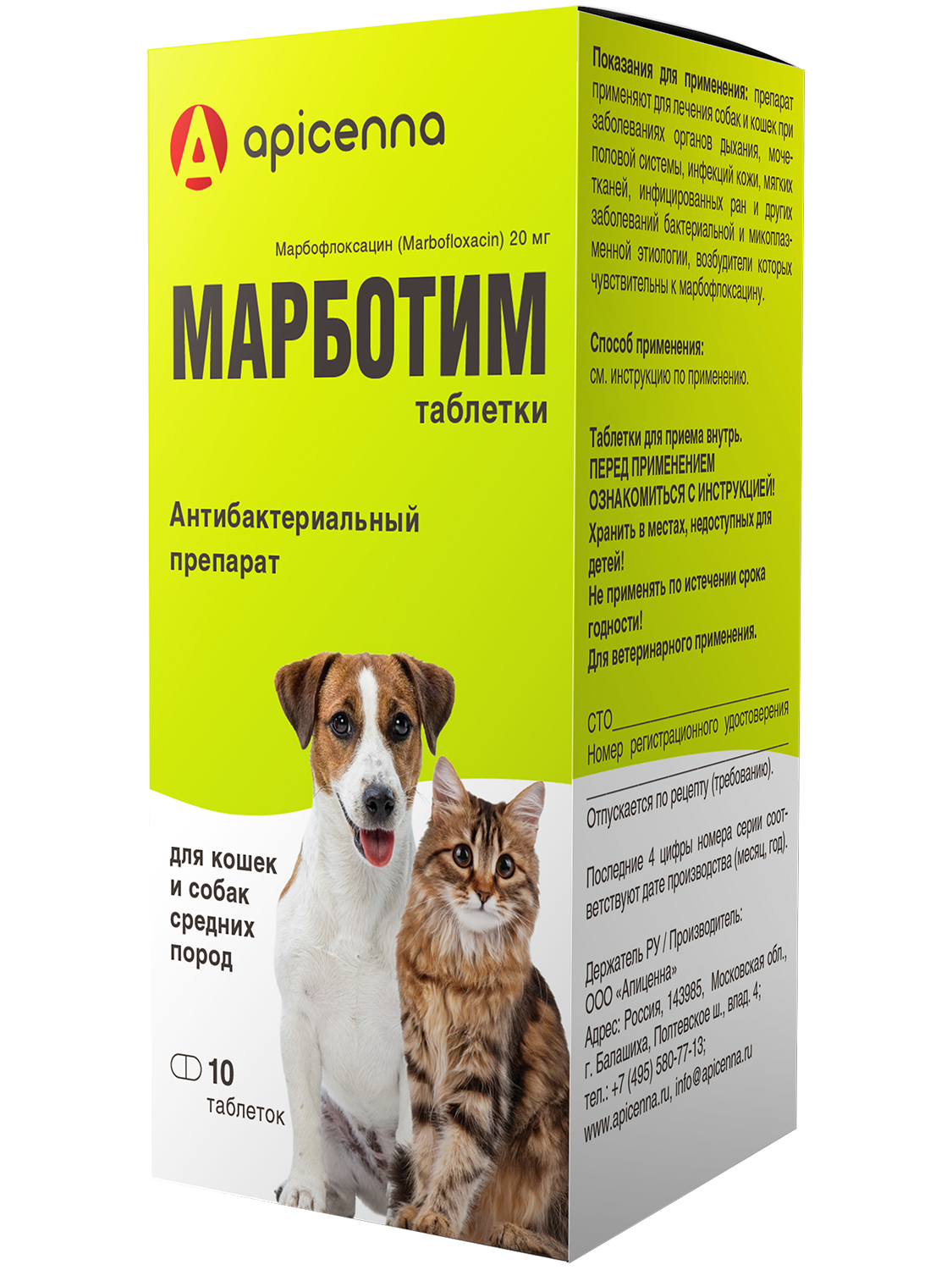 Марботим назначают собакам и кошкам для лечения заболеваний дыхательных путей, мочеполовой системы, кожи, мягких тканей, инфицированных ран, а также других инфекций бактериальной и микоплазменной этиологии, возбудители которых чувствительны к марбофлоксацину.