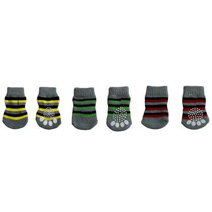 Полосатые домашние носочки - не только стильный, но и полезный аксессуар для вашего питомца. Такие носочки ограждают интерьер от когтей любимца и, благодаря противоскользящему покрытию, позволяют четвероногому питомцу с комфортом передвигаться по паркету, кафелю и другим скользким покрытиям. Теплые, легкие и функциональные, эти носочки также отлично подойдут для согревания лапок питомца в зимний период, если их одеть под ботинки. Цвета: серые в красно-черную, зелено-черную или желто-черную полоску. Размеры изделия: 3х7,5см.