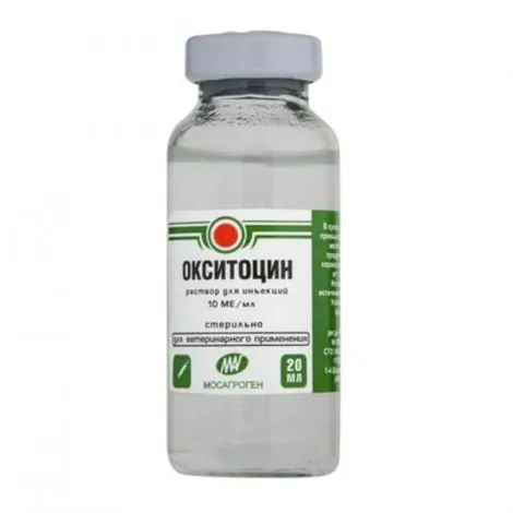 Раствор Окситоцина – гормональный препарат действующим началом которого является окситоцин (синтетический аналог полипептидного гормона задней доли гипофиза). Препарат представляет собой бесцветную прозрачную жидкость со слабым специфическим запахом. В 1 мл препарата содержится 10 ЕД окситоцина. Препарат выпускают расфасованным во флаконы вместимостью 20 мл, закрытых резиновыми пробками и закатанных алюминиевыми колпачками. Единица упаковки маркируется согласно нормативной документации.