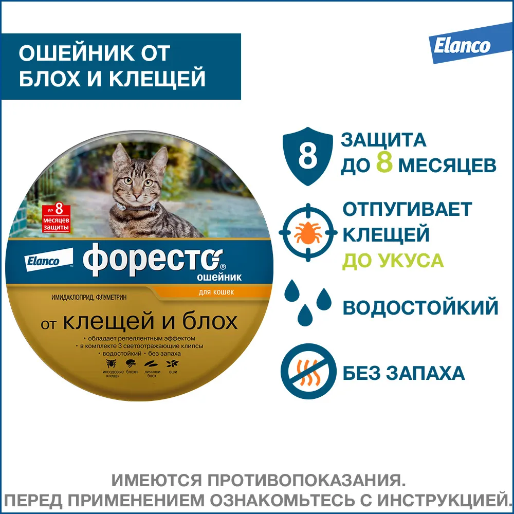 Ошейник Форесто® – продукт, помогающий вам защитить собаку от укусов клещей и блох на 240 дней. Носить ошейник рекомендовано постоянно. Просто наденьте ошейник на кошку. Препарат немецкого производителя Bayer.