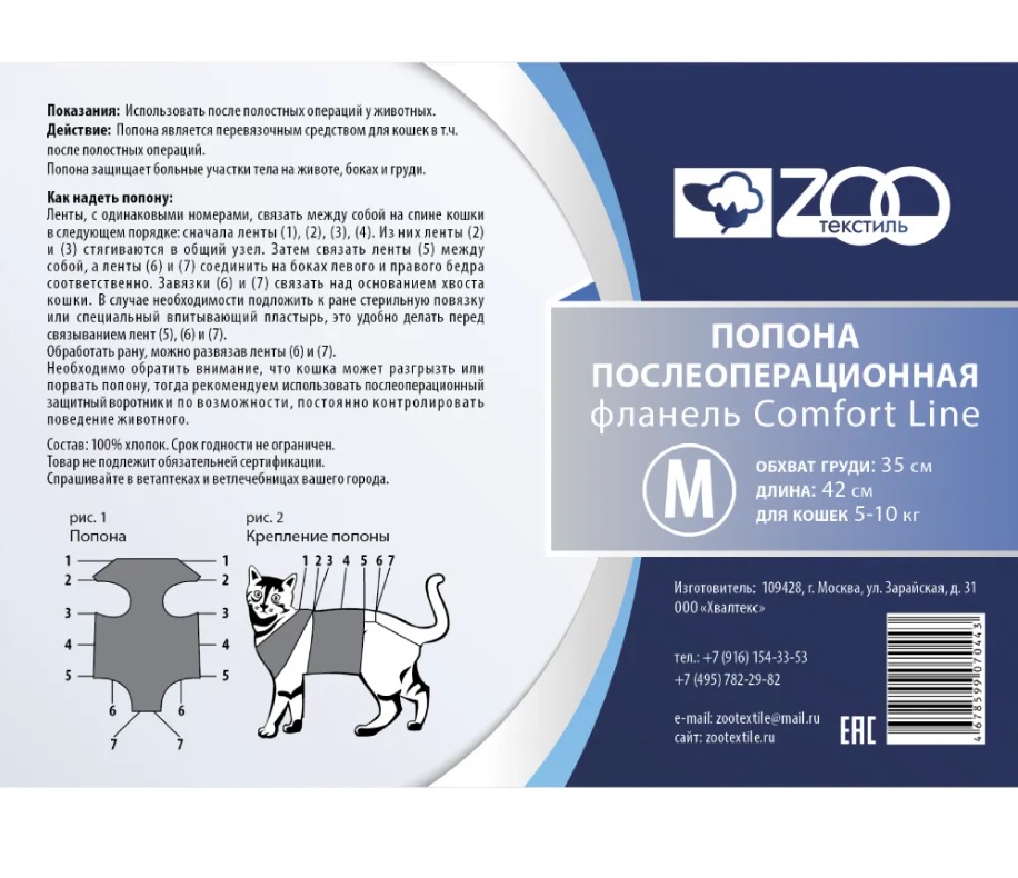 Попона послеоперационная фланель кошки M. Основное свойство изделия — предотвратить попадание болезнетворной микрофлоры на хирургический разрез. Дополнительно защищает поверхность раны от солнечных лучей, грязи и механических повреждений.