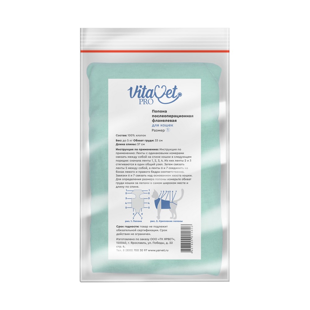 Попона "VitaVet PRO" ВИТАВЕТ ПРО послеоперационная для кошек фланелевая №1 малая