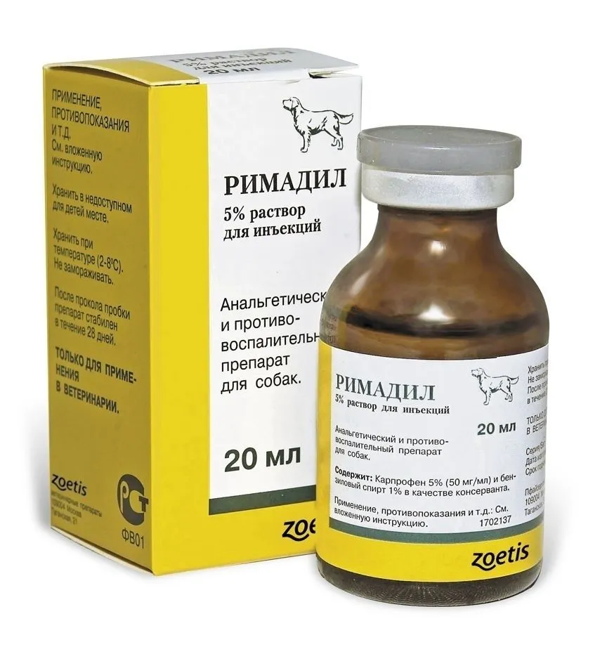 Римадил 5%, Пфайзер США (20 мл) — раствор для инъекций при заболеваниях опорно-двигательного аппарата собак Римадил инъекция (Pfizer)