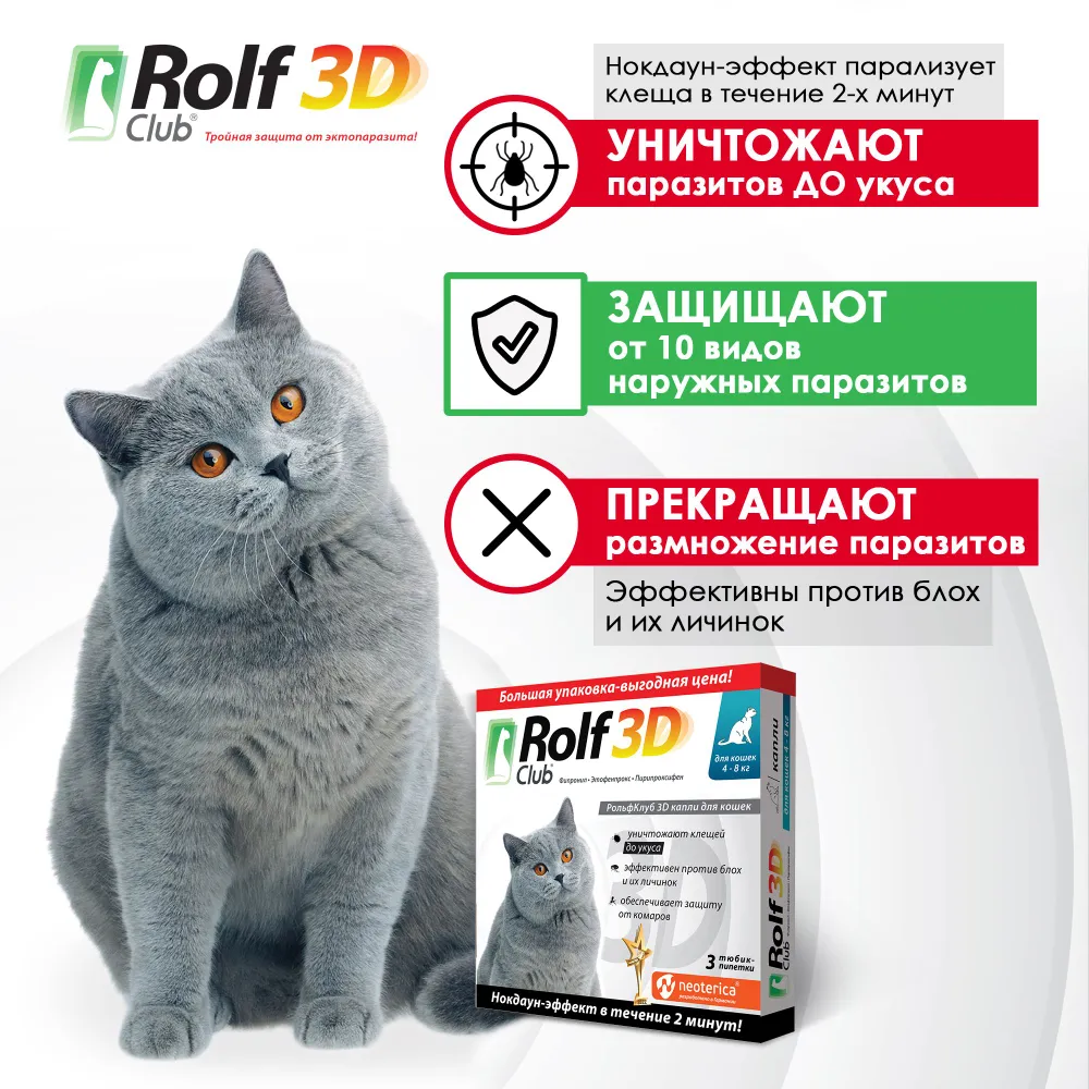 РольфКлуб 3D капли (3пип) д/кошек более 4кг от клещей, блох и комаров |