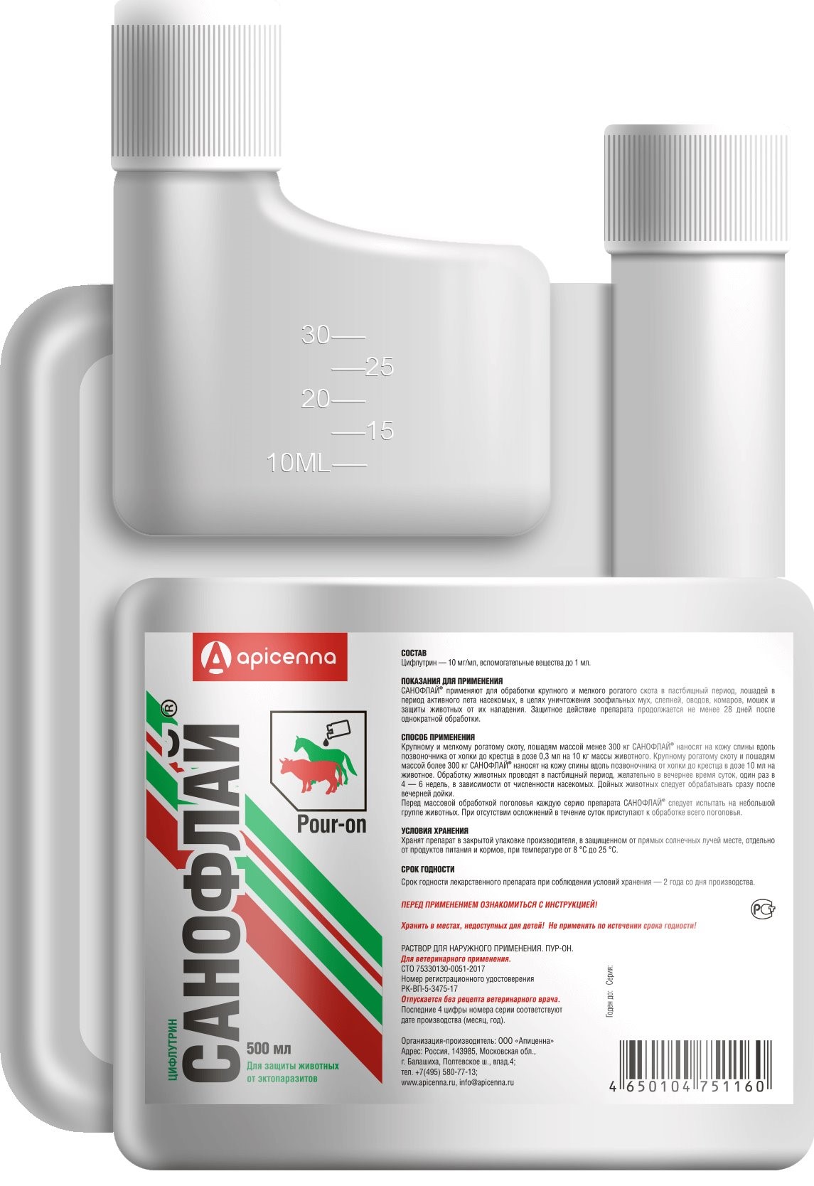 Крупному рогатому скоту и лошадям Санофлай применяют с помощью дозирующего устройства, наносят на кожу спины вдоль позвоночника от холки до крестца в дозе 0,3 мл на 10 кг массы животного.