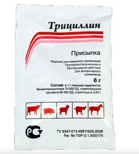 В хирургической практике трициллин используется наружно в виде присыпки при кастрациях, гнойных ранах, трофических язвах, послеоперационных осложнениях, а также можно использовать для приготовления сложных порошков, применяемых для лечения некробактериоза и копытной гнили.