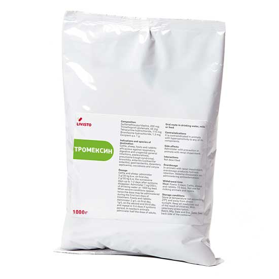 Крупному рогатому скоту, свиньям, овцам и козам препарат задается в дозе 1г тромексина на 10кг массы тела животного в первый день и 0,66г тромексина на 10кг массы тела в последующие 2 – 3 дня. Препарат может задаваться с водой, с молоком или с кормом.