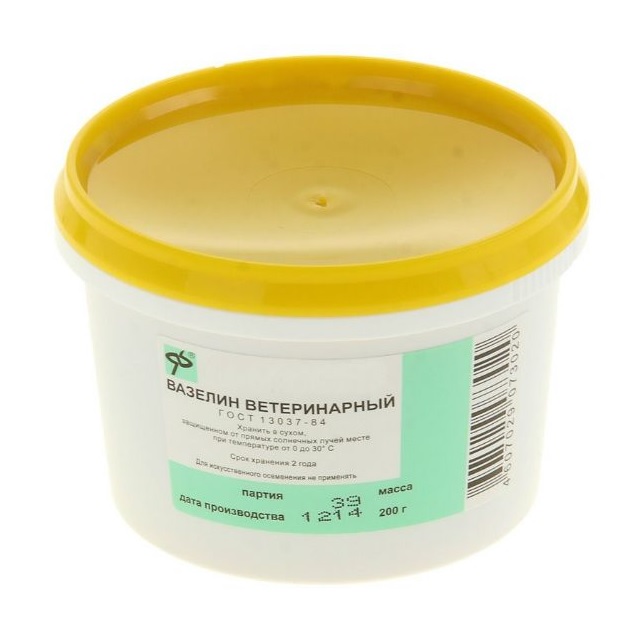 Вазелин ветеринарный применяют для смазывания вымени животных после доения с целью предотвращения образования трещин, а также для искусственного осеменения животных. Является универсальной основой при приготовление мазей для животных.