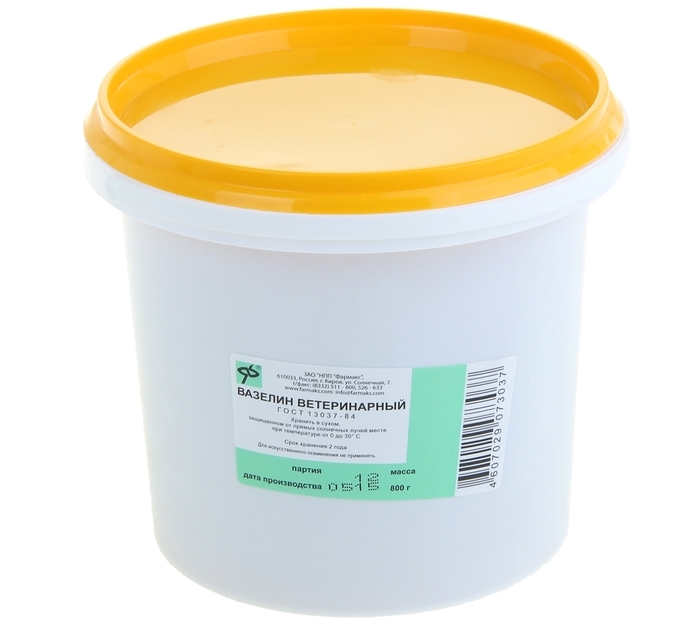 Вазелин ветеринарный производится в соответствии с ГОСТ 13037-84. Он предназначен для смазывания вымени с целью облегчения процесса доения и предотвращения последствий машинного доения, а также используется в производстве кремов и мазей ветеринарного назначения.