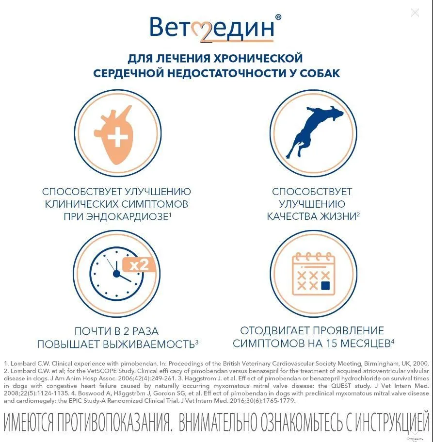 1 капсула/таблетка препарата Vetmedin® содержит: действующего вещества Пимобендана от 1,25 мг до 10 мг в зависимости от дозировки