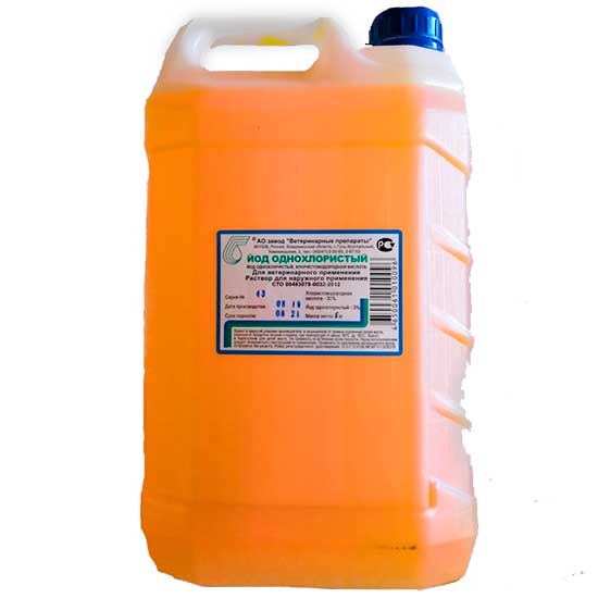 Йод однохлористый применяют в виде растворов для: лечения животных, пораженных стригущим лишаем; антисептической обработки вымени коров; профилактической и вынужденной дезинфекции поверхностей животноводческих, в том числе птицеводческих, помещений и находящегося в них технологического оборудования, вспомогательных объектов животноводства и инвентаря по уходу за животными, холодильных камер, червоводен, обработки скорлупы яиц, а также для аэрозольной обработки воздуха животноводческих, в том числе птицеводческих, помещений, в отсуrствии животных и птиц.