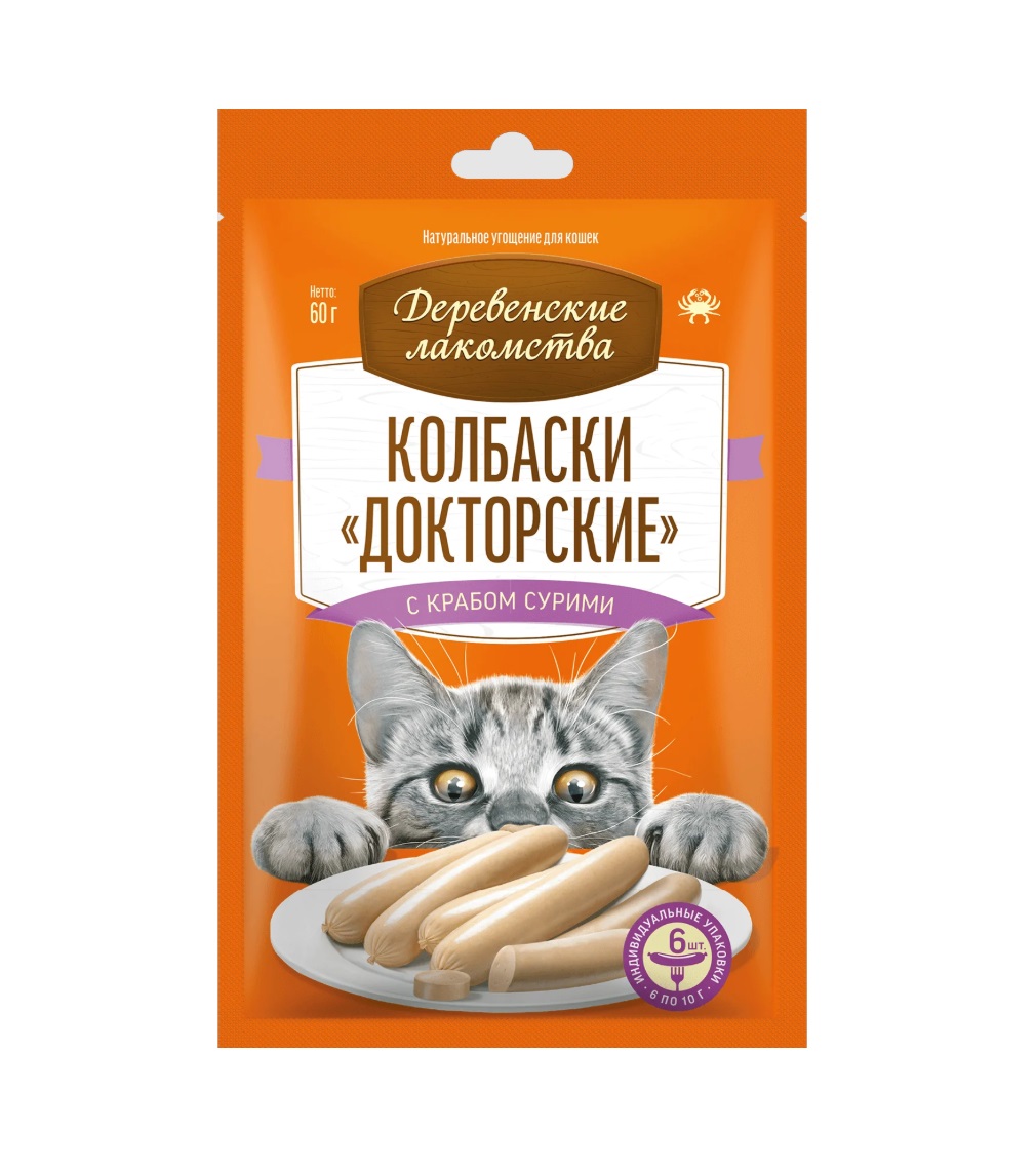 Деревенские лакомства колбаски Докторские 6*0,01кг с крабом сурими для кошек (79217872)